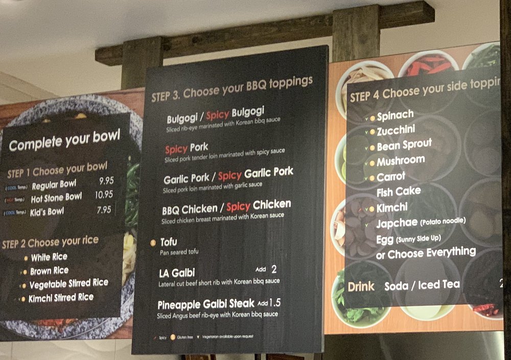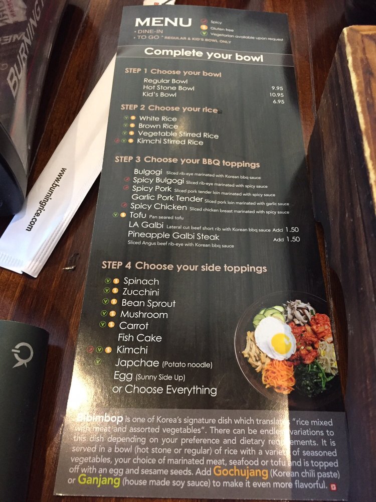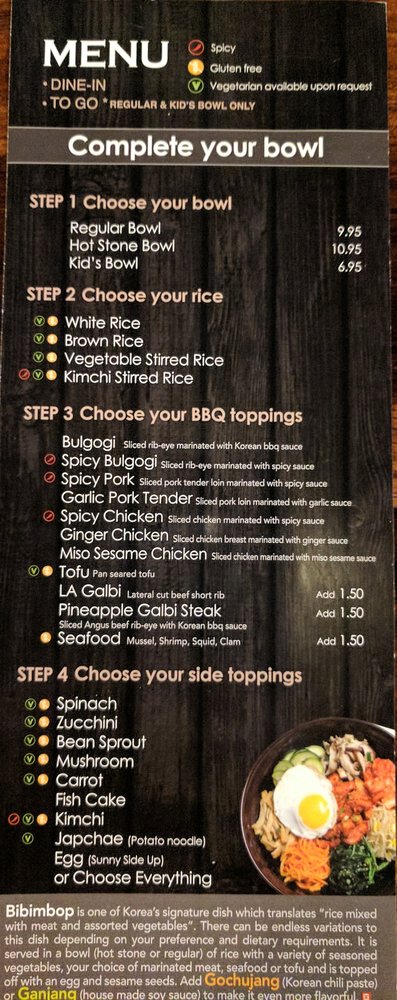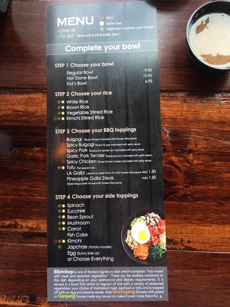 Build your own Bibimbop with your choice of base, protein, toppings, egg and sauce!