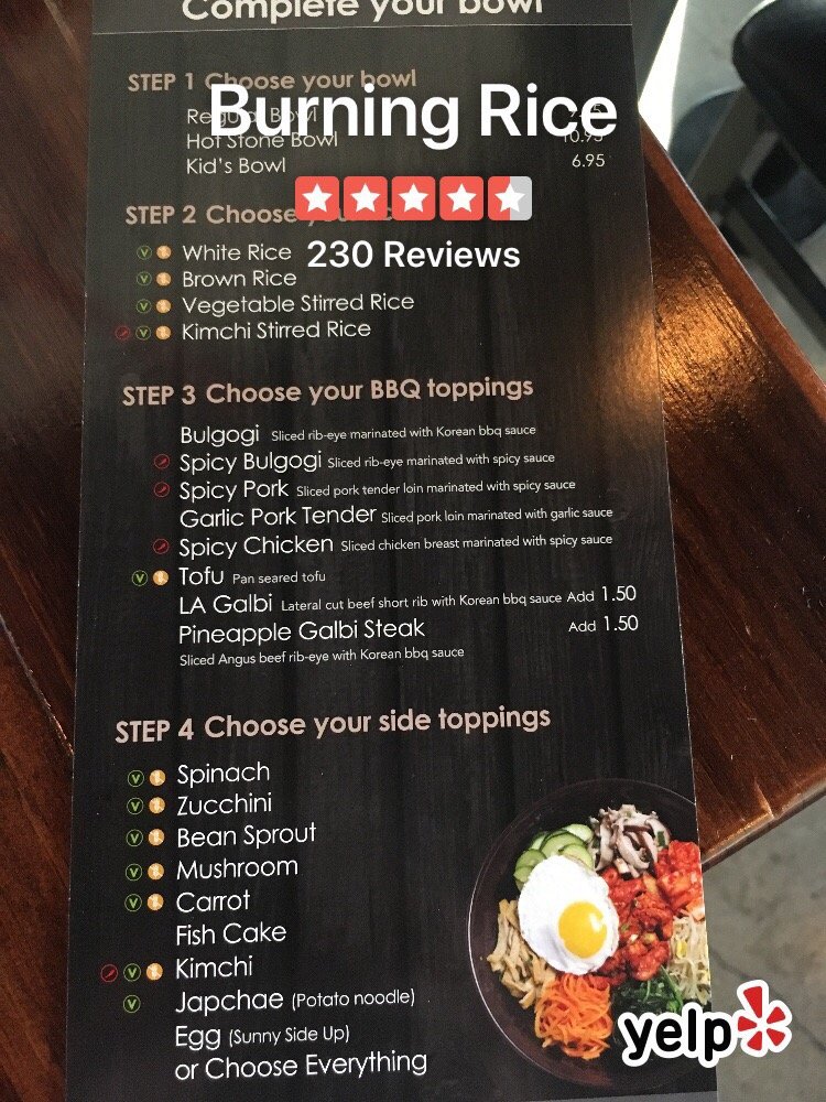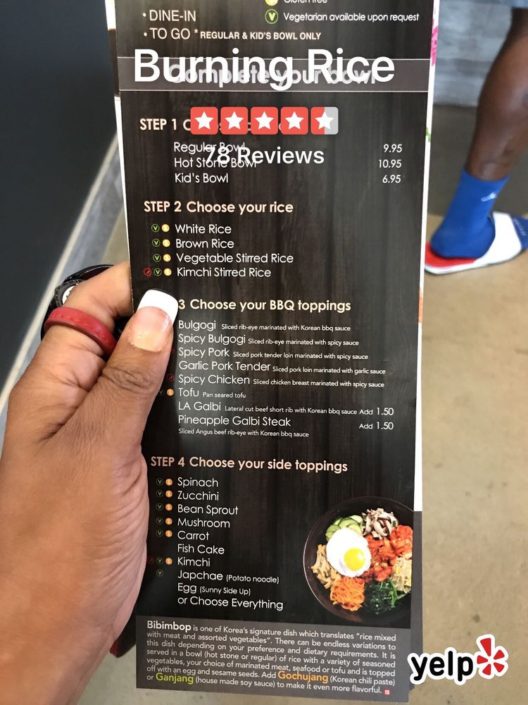 Introducing the menu at Burning Rice, a Korean BBQ restaurant in The Colony, TX, known for its innovative twist on traditional Korean comfort food like bibimbap. Customers rave about the flavorful dishes, generous portions, and quick service. The bulgogi bowl is a standout, with delicious flavors and plenty of sides to share. The BBQ Chicken Bibimbop is a must-try, with a perfect blend of ingredients and a hint of spice from the Gochujang sauce. While some customers wish for more rice, the overall quality and taste of the dishes are commendable. The self-service technology and cozy ambiance make dining at Burning Rice a great experience. Don't miss out on their spicy bulgogi hot stone bowl or the crispy chicken with all the toppings. With options for vegan and limited vegetarian dishes, Burning Rice caters to a wide range of preferences.